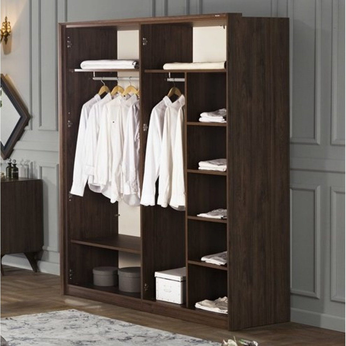 Четырехдверный распашной шкаф для одежды и белья с зеркалом в спальню ALEG-34серии Кастелло от Беллона – потрясающе великолепное и выгодное предложение для просторных спален и гардеробных от известного турецкого производителя. Больше нет нужды выстраивать линейные композиции и переживать, насколько гармонично, целостно и эффектно они будут смотреться в интерьере – роскошное дизайнерское решение уже готово.