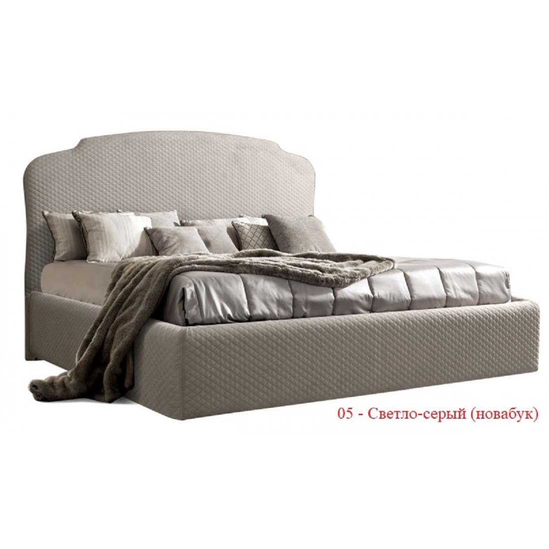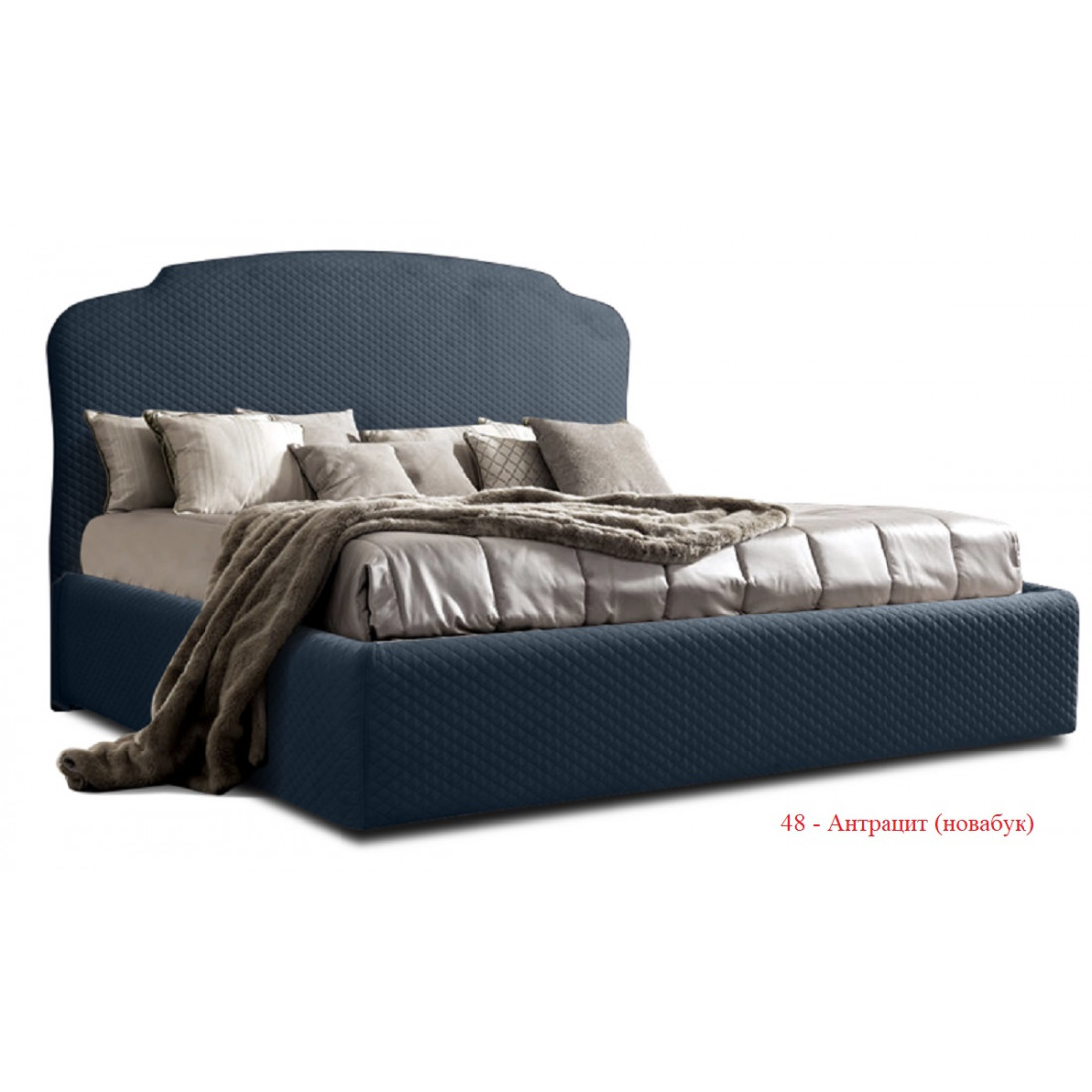 В этой кровати отсутствует изножье, есть только высокое изголовье фигурной формы. Если говорить о материале обивки, то это ткань из каталога итальянского производителя Novabuk.