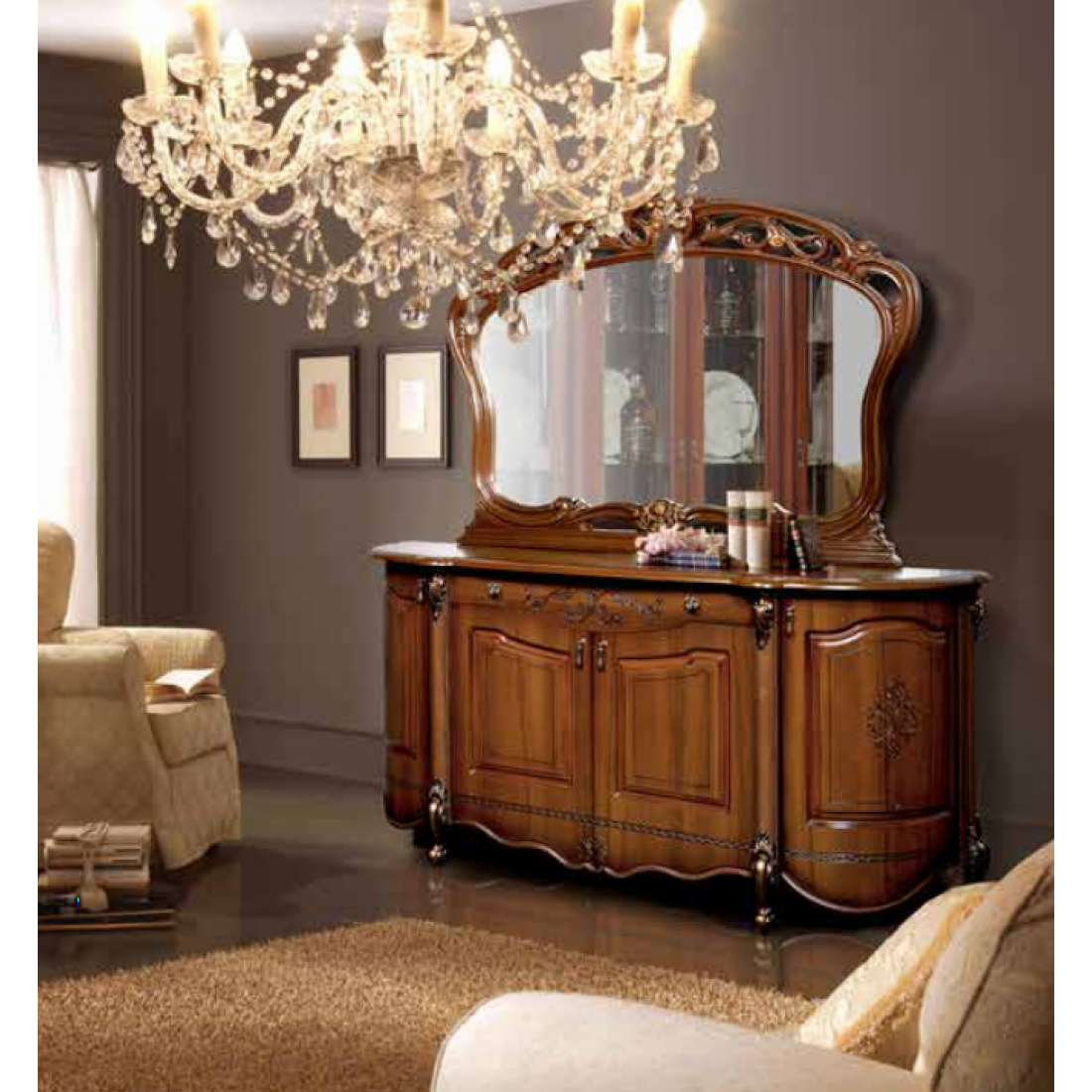 Комод для посуды с зеркалом Аллегро 5 (орех) – данная модель сделает вашу гостиную неповторимой и придаст ей богатую атмосферу. Он имеет четыре дверцы за которыми скрываются большие вместительные полки, что с легкостью поможет вам хранить все необходимые вещи. По середине есть не большая вытягивающаяся полка, которая по бокам имеет две ручки в виде кнопки. Комод «Аллегро» идет в комплекте с большим зеркалом которое украшено резной вставкой в сочетании с тонкой росписью, что подчеркнет классический стиль и послужит показателем богатства и престижа хозяев дома.
