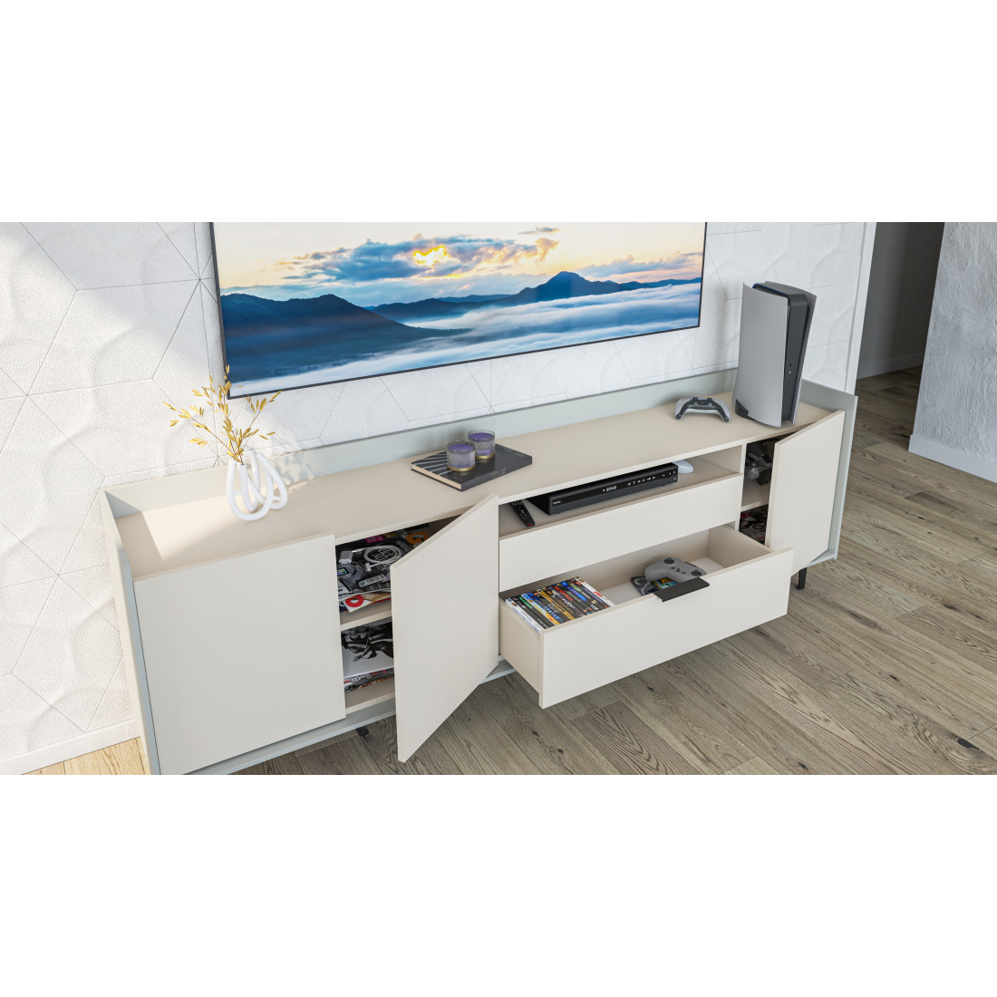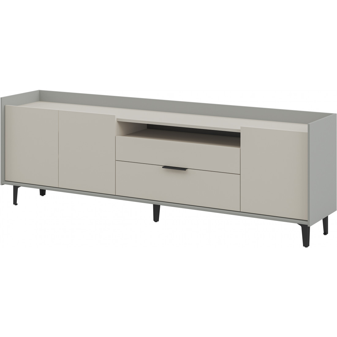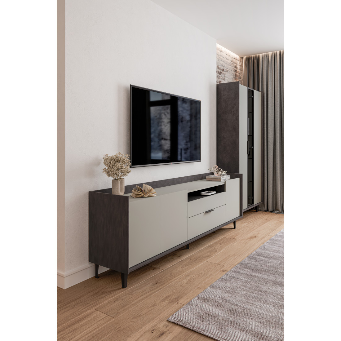 Элегантная тумба под ТВ Модена станет идеальным дополнением для вашей гостиной. Выберите из трех стильных вариантов цветов: Белый-Дуб Элисон, Лунный камень-жемчуг, Металл Бруклин-лунный жемчуг. Ножки из металла обеспечивают устойчивость. Длинная тумба предлагает два отделения с полками для размещения аудио- и видеоаппаратуры, а также одно отделение с двумя удобными ящиками. Над ящиками расположена ниша для мелочей. Эта тумба сочетает в себе функциональность и стиль, делая ее идеальным решением для вашего медиацентра в гостиной