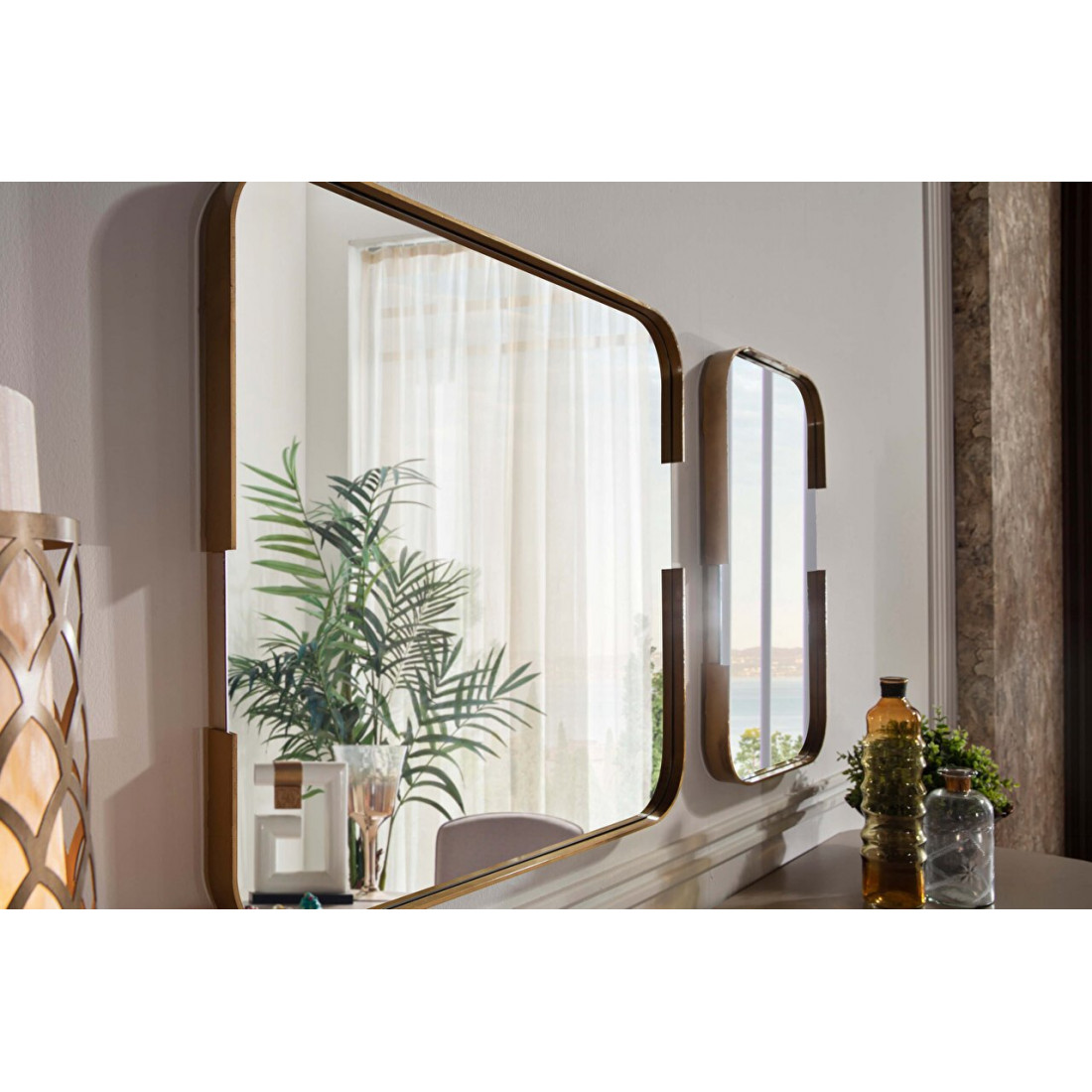 Интересный комплект из 2-х зеркал SANV-11 предлагается к тумбе (комоду, прилавку) турецкой коллекции Санвито SANV-10. Два разных по размеру, но одинаковых по стилю зеркала очень оригинально смотрятся не только в композиции с комодом, но и как отдельный предмет интерьера. Большое зеркало размером 690х690(мм), маленькое -370х690(мм) обрамлены золотистой коемкой.